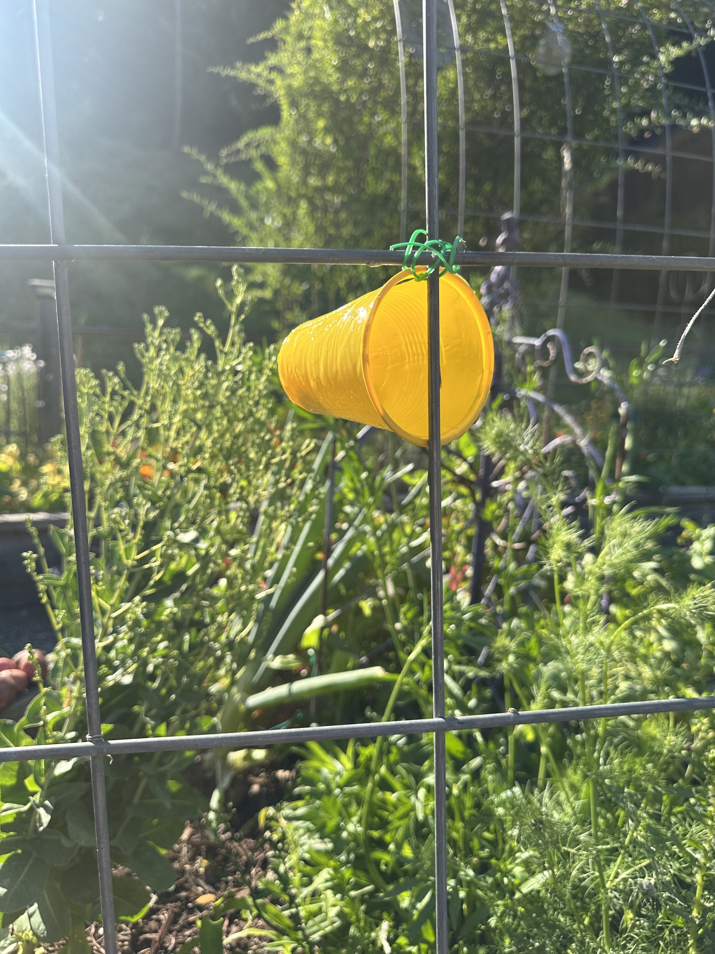 4. Attach the cup to a stake, tomato cage, or nearby structure. I have had great success punching a hole in the rim of the cup and tying it onto trellis panels, but a simple stake works just as well.