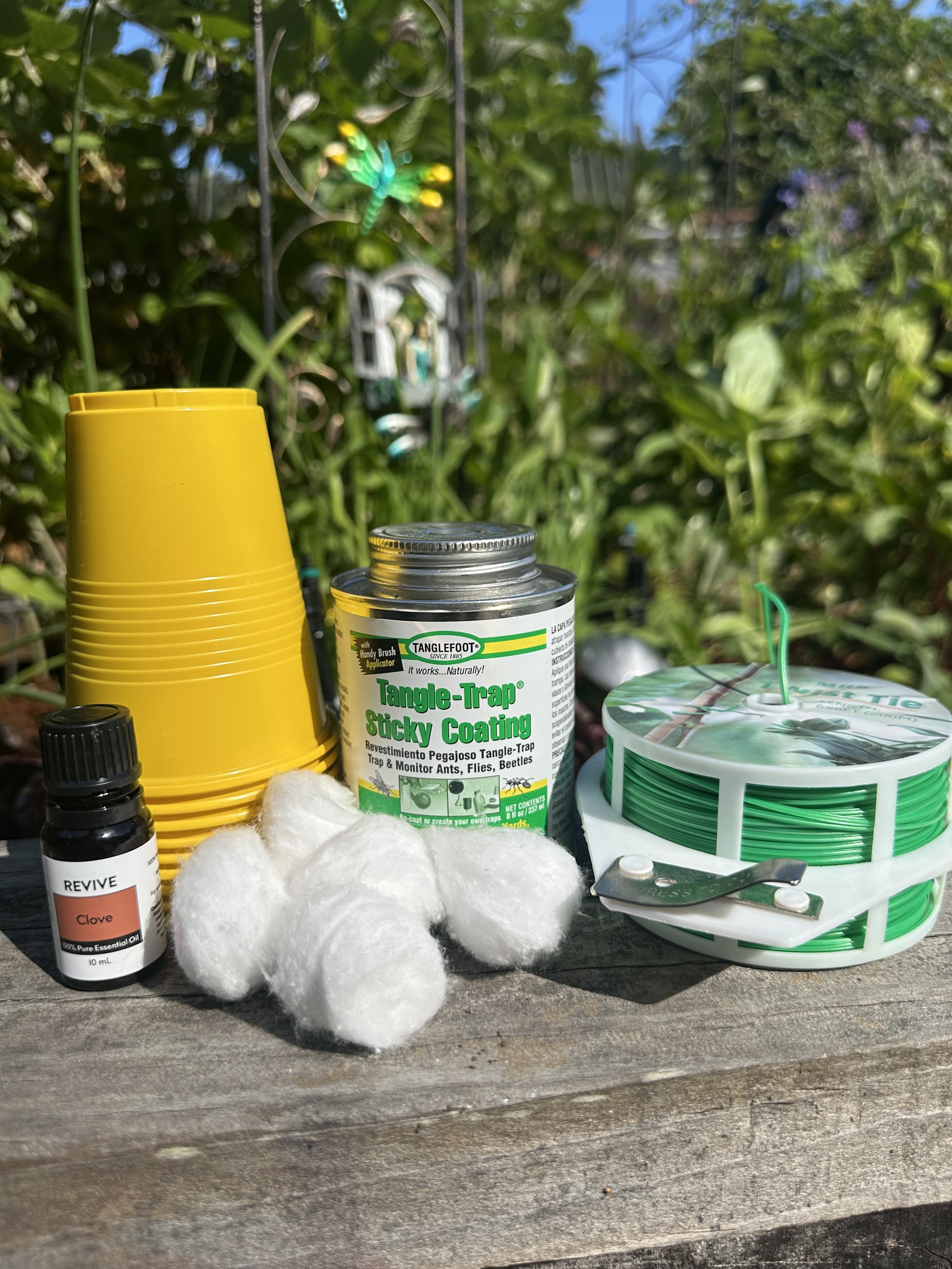 3. Place a cotton ball soaked in clove essential oil inside the cup. Cucumber beetles find the scent irresistible. The oil lures them close enough to investigate the trap, where they get stuck. I also put another layer of Tanglefoot inside the cup, almost up to the cottonball. This provided one more area to trap them.