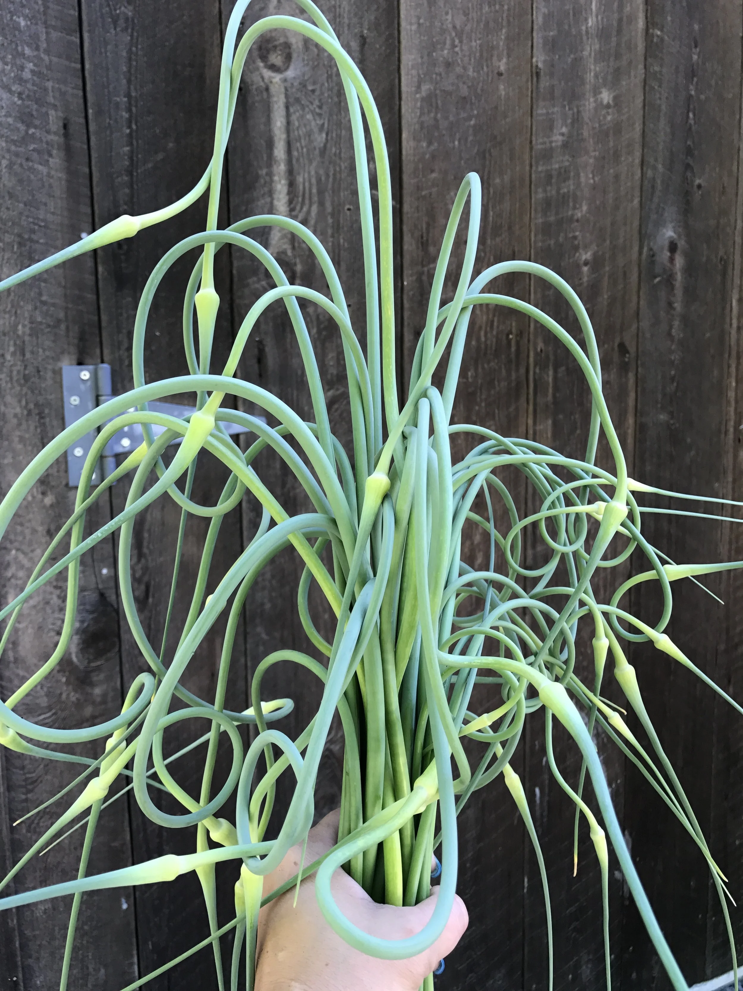 One of the great perks of growing hardneck garlic is the edible scape; a curly green flower stalk that emerges in late spring. Cutting it off early encourages the plant to focus its energy on developing a larger bulb, and as a bonus, the scape is edible. In early spring, before basil season, garlic scape pesto is a bright, flavorful way to satisfy the need for something homegrown. Scapes have a mild, garlicky flavor and can also be chopped like green onions and tossed into stir-fries, eggs, pastas, or anything that needs a savory kick.
